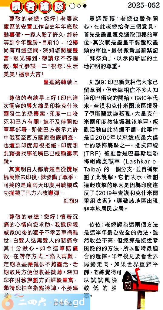 第零五二期讀者論談 1.尊敬的老總,您好!老婆家庫區的安置工作自去年年底啟動籌備,一家人盼了許久,終於等到今年選房。目前10-12樓尚有可選空間,深知您閱歷豐富眼光獨到,懇請您不吝賜教,幫忙參謀一二!祝您:生活美美!遇事吉!豐迴路轉敬上 〖豐迴路轉〗:老總也替你開心,在此老總給你三個意見,首先是盡量避免選取頂樓的單位,其次就是盡量不要選取盡頭的單位。最後搬新居前緊記「拜祭角」,以示向新居的土地神明的尊重。 2.二尊敬的老總早上好!印巴這次衝突的導火線是印控克什米雨發生的恐襲案,印度一口咬死和巴方有關,迫不及待開始軍事部署,即使巴方表示允許中俄甚至西方國家徹底調查,也遭到印度無視拒絕。印度想要藉機找事的嘴巴已經顯露無疑。其實明白人都清楚自從攪屎棍萬斯去印後,就發動了戰爭,可笑的是這兩天印度用戰機成功攔截了巴方六枚導彈...紅旗9 〖紅旗9〗:印巴衡突相信大家已留意到,但老總相信不多人知道印巴衡突的開始。1980年代末,查謨和克什米爾地區爆發了伊斯蘭武装叛亂,大量克什米爾印度教徒遷離該地區,叛亂活動自此持續不斷。此事件是自2000年以來造成最大傷亡的恐怖襲擊之一。抵抗陣線()被推断是巴基斯坦恐怖組織虔誠軍(--)的一個分支,並自稱策劃了此襲擊。它們表示,策劃這起攻擊的原因是因為印度違反了《2019年查謨和克什米爾重組法案》,導致該地區出現非本地居民定居。 3.尊敬的老總:您好!懷著沉痛的心情向您求助。我遠房親戚家00後的獨子不幸因車禍離世,白委人送黑鬓人的悲痛令其十分揪心。如今這筆赔償款,在儲存方式上陷入兩難定期收益穩健卻不夠靈活,活期取用方便但收益微薄。深知您在財務規劃方面經驗豐富,懇請您抽空指點迷津,不勝感激!依依敬上 〖依依〗:老總認為這兩個方法是這半年最為安全的做法,雖然收益不高,但總算是接近零風險的的方法,所以暫時最適合的選擇。半年後則要看世界局勢走向,如果世界重歸平靜,老總覺得可以試試風險較低的股票。