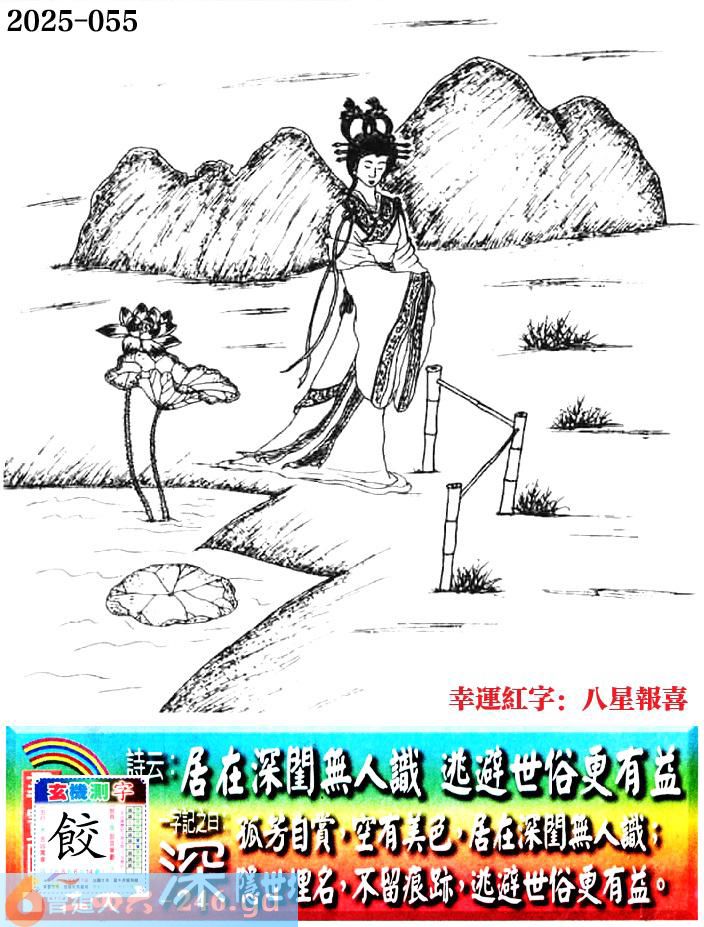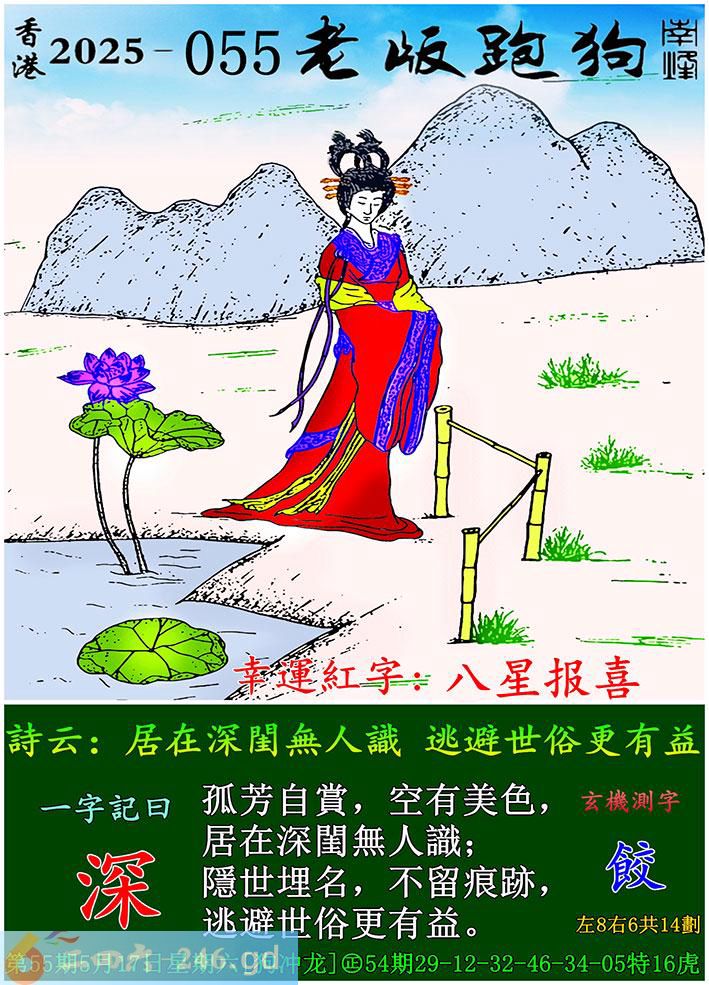 055期老版跑狗一字記之曰:【深】 詩雲:居在深閨無人識,逃避世俗更有益。