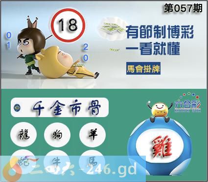 057期开奖时间2025年05月22(星期四)晚9:30开(农历四月廿五兔冲鸡) 生肖属性:辛卯日;五行属性:木;地支六冲:兔冲鸡,无牛;六合:狗;三合:猪羊。空亡肖:马虎。 六合不出:鸡鼠猪;三合不出:马牛龙;应开生肖:鼠龙牛猪鸡。防:蛇羊。 开奖日必开生肖兔日:兔马牛鼠鸡蛇 开奖日日柱对应五行辛卯日:木水火 开奖日必开生肖辛卯:狗猪鸡虎蛇龙 上期马,本期必开:牛虎狗羊马蛇猪 《057期》《《香港掛牌之全篇》》 057期正版彩图挂:18爆:鸡挂牌成语:千金市骨挂牌出肖:龙狗羊蛇牛马 [释义]花费千金,买千里马的骨头。比喻罗致人才的迫切。 057期另版香港马会挂牌:36兔 057期马会挂牌21射4002 057期正版数码挂牌:46射:0827壹句真言:夜来山月最分明(12568) 057期蓝天玄挂牌:35牛 057期四柱《引狼入室太轻权》 057期藏寶圖新:人拥青门动若雷老:肥水东流无尽期禁:猪禁:1尾玄機字:《韵》 057期跑狗:【蟲】孤枝鳥立,靜水悠悠。蟲藏於木,轉瞬成擒。玄機測字:《散》 057期香港关门联:一勇之夫楚霸王,兔虎猴鼠是特码。解[夫][1862] 057期香港开门联:准时鸡啼催早起,本期要钱看蓝绿。解[起][7653] 057期另香港关门联:快马加鞭三千里,金猴跳跃十万程解[鞭][57629] 057期另香港开门联:年复一年龄见小,身毒心毒本性毒解[龄][45291] 057期内部万花来料:万花开在六长二短二七边,红绿色彩尽显鼠藏鼠居 057期台湾玄门挂牌:[四八驰驱][769] 057期挂历诗:平生难得糊涂进,醉生梦死灌三杯。 057期火车头:烧伤马。诗:龙死兔伤,四六分明把数算。 057期火烧图解:火烧“龙”。诗:二十三四五个开,四九带六准中彩。 057期无字天书:常赌未必全尽输,平心静气可和详。鸡28 057期最老版无字天书:四面楚歌奉上天,两地同发带救归。马23 057期九宫禁肖:龙 057期必中人物:介子推 057期二字经:伤气 057期六合信箱紅字:百密一疏暗码:10192228 057期一語中特:三言兩語 057期挂牌绝杀料/挂牌绝杀:猪 057期正版黄大仙射箭图:15射2639 057期另版黄大仙射箭图:44射2507 057期香港牌:[一六开][209] 057期内部运程曰:七个女人。配密码:{120} 057期香港信封挂牌:衣带自然宽(未时上下)加6125 057期波段预测:主:08----2029--30 057期特码大小单双句:引狼入室太轻权解?? 057期特码大小单双句:满心委屈何处诉解?? 057期铁算盘:士女欢娱万国同(世上显英才)开:? 057期香港版《香港六合天书挂牌》天书:九字独取二来合,二八丁配五不满。天码:05、18、24、26、36、44、20、33。 057期(香港版)六合对联诗:不离五后上联:三三不分在来九下联:猪前虎尾必中特解:七。密码:904317 057期正版马会大门口挂牌一句话:本期三弯过后绕七曲【挂11送28】开 057期另类马会大门口挂牌一句话:猪龙虎蛇破行飞【马会送46】开 057期香港生活开门联:一五见八是常事,一五见七是常事。解[两][542367] 057期香港生活关门联:三九二五同宫斗,猪前虎尾必中特。解[开][752003]