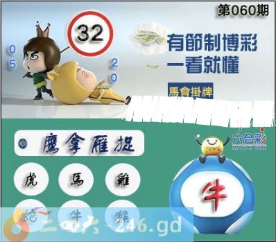 2025年060期正版彩图挂:32 爆:牛 挂牌成语:鹰拿雁捉 挂牌出肖:虎马鸡蛇牛猴