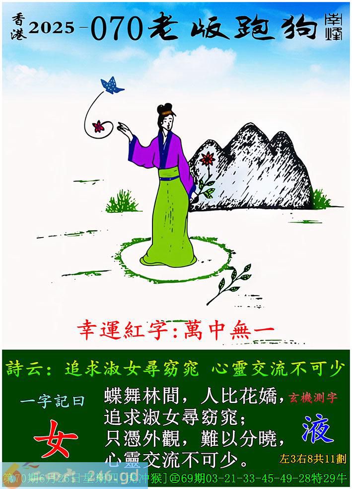 070期老版跑狗一字記之曰:【女】 詩雲:追求淑女尋窈窕,心靈交流不可少。 蝶舞林間,人比花嬌,追求淑女尋窈窕; 只憑外觀,難以分曉,心靈交流不可少。 玄機測字:《液》