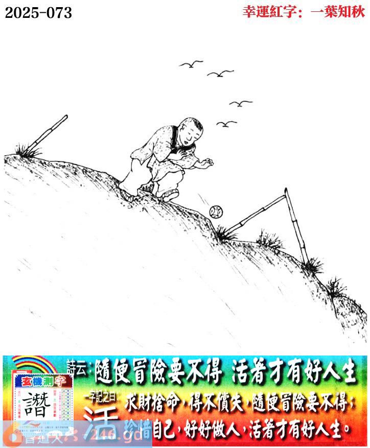 073期老版跑狗一字記之曰:【活】 詩雲:隨便冒險要不得,活著才有好人生。 求財捨命,得不償失,隨便冒險要不得; 珍惜自己,好好做人,活著才有好人生。 玄機測字:《譛》