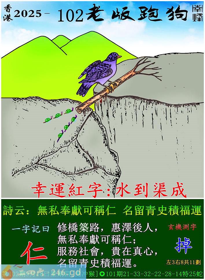 102期老版跑狗一字記之曰:【仁】 詩雲:無私奉獻可稱仁,名留青史積福運。 修橋築路,惠澤後人,無私奉獻可稱仁; 服務社會,貴在真心,名留青史積福運。 玄機測字:《掉》