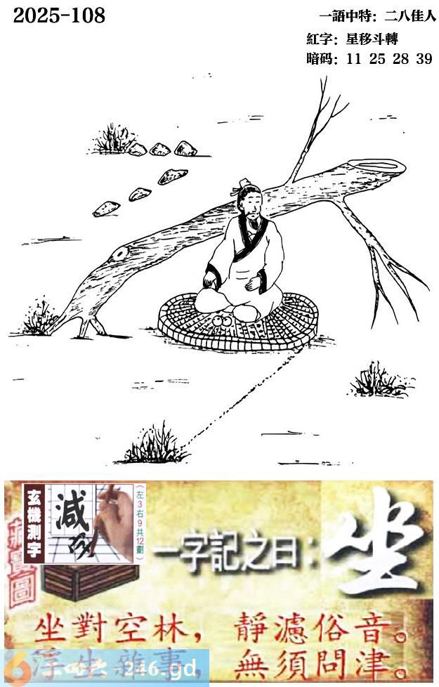 108期跑狗一字記之曰:【坐】 坐對空林,靜濾俗音。 浮生雜事,無須問津。 玄機測字:《減》 一語中特:二八佳人