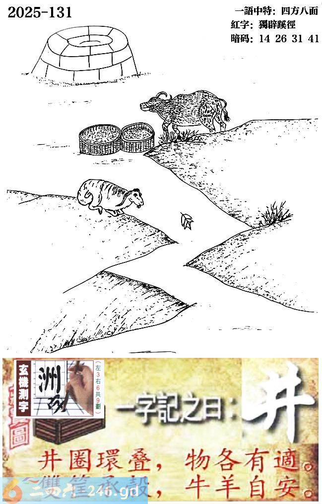 131期跑狗一字記之曰:【井】 井圈環疊,物各有適。 雙筐承殼,牛羊自安。