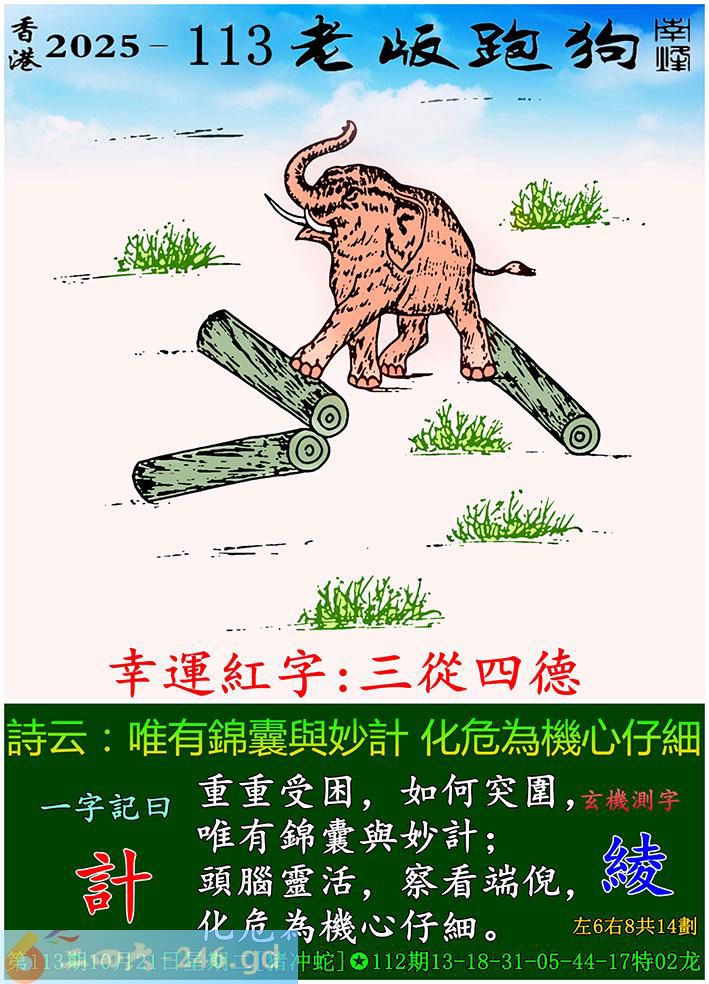 113期老版跑狗一字記之曰:【計】 詩雲:唯有錦囊與妙計,化危为机心仔细。 重重受困,如何突圍,唯有錦囊與妙計; 頭腦靈活,察看端倪,化危為機心仔細。 錦囊與妙計:利用錦囊的巧计来突围困境,这词听起来很科幻,很难去比喻一个生肖。但!这个“錦囊”我不认为它是一件武器,更像是一个陷阱,只有“陷阱”与“妙计”结合它才能脱离困境。 就比如:頭腦靈活的【老鼠】被夹子夹到腿时,巧用弃腿“等”方式来突圍困境。把每一次的遭遇‘提升至个人的生存能力(完美诠释”化危为机心仔细“的构想)把危险转化为机智。 一肖【鼠】42表达能力有限