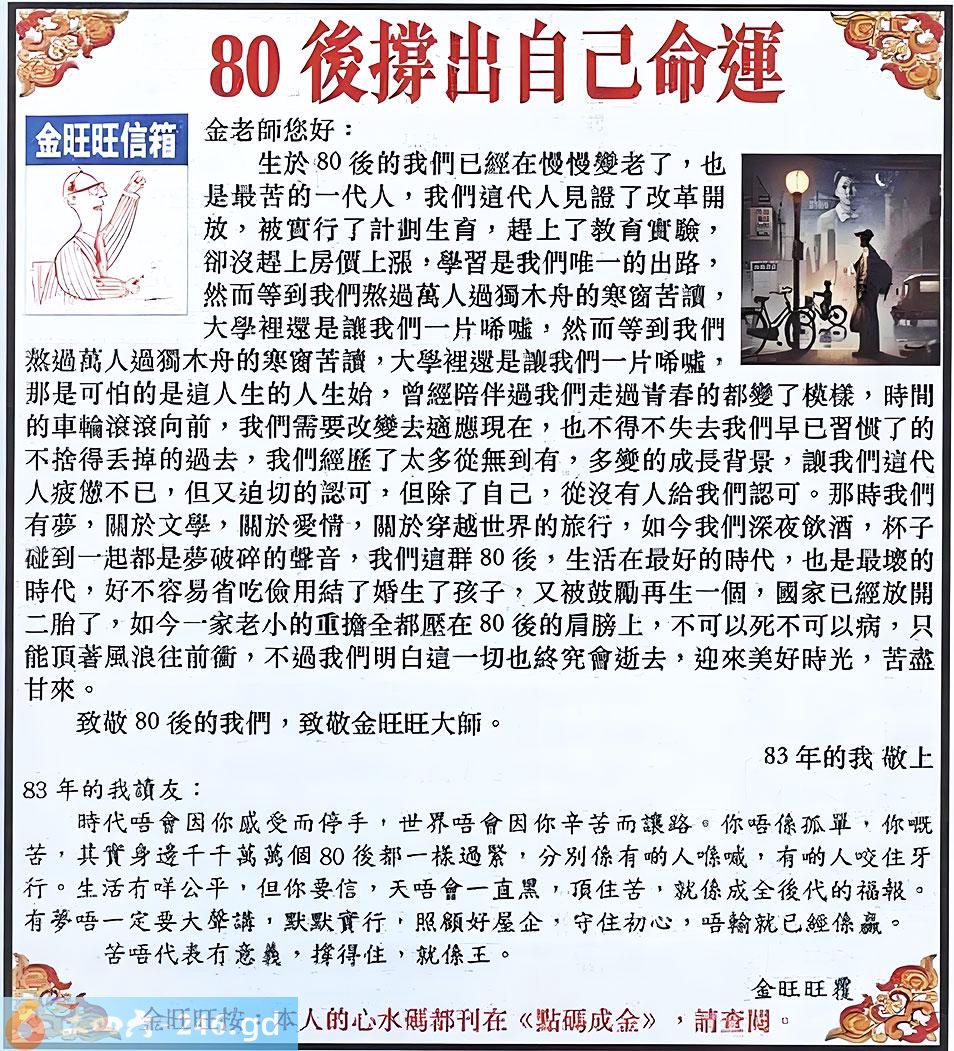122期:金旺旺信箱彩民推荐→→《80 後撐起自己命運》
