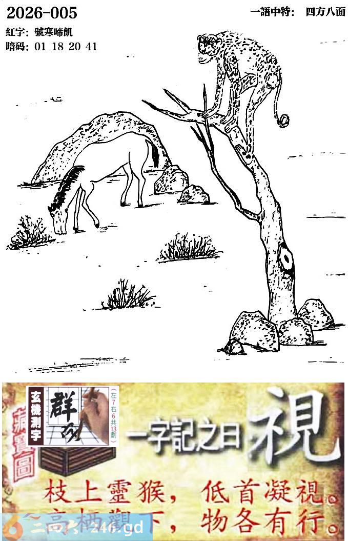 005期跑狗一字記之曰:【視】 枝上靈猴,低首凝視。 高棲觀下,物各有行。 玄機測字:《群》 一語中特:四方八面