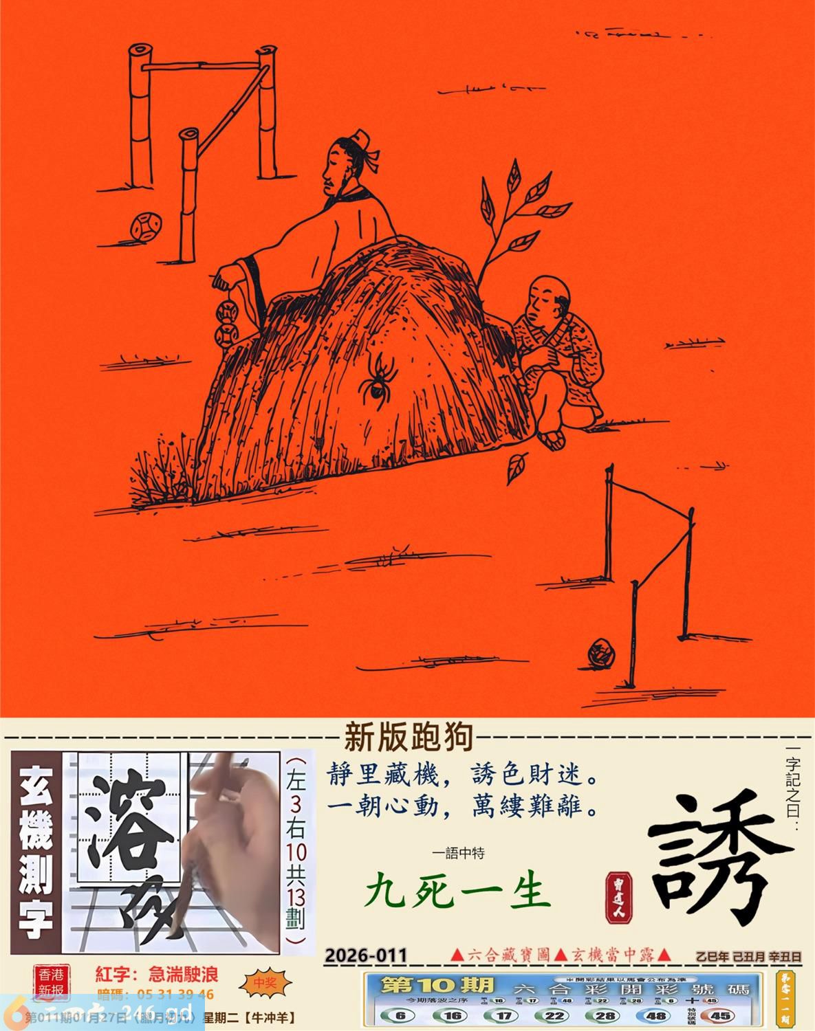 2026年1月27日011期羊(乙未)(壁上土) 011期:老版跑狗玄機一字記之曰:【走】 詩云:走為上着避鋒芒險境前前莫逞強 箭如雨下,如何能擋,走為上着避鋒芒; 君子不立,危牆中央,險境前前莫逞強。 玄機測字:《提》 密圖詩:酒足飯飽去按摩 《記》:同桌對座賽象棋 特碼大小單雙句:一窩鳥蛋有六個 今期必中:趙雲 011期:特碼歇后語 早上没刷牙-----嘴巴不干净 011期正版四字梅花诗:恕不奉陪。 011期火车头:烧伤龙。诗:鸡死猪伤,十二生肖排第四。 011期香港第一手欲钱料:龙? 011期曾道人说:“木?” 011期另版四字梅花诗:四面青山。 011期香港第一手欲钱料:欲钱找伶俐的动物。 011期曾道人说:“为什么每个人都比较喜欢钱呢”? 011期:二字經:好數 011期:电灯是特码 011期:智力金壤;一丝不挂 011期:信箱紅字:【急湍駛浪】 011期:【暗碼:05-31-39-46】 011期:一語中特:【九死一生】 發財玄機圖:冷静守候弓身嘶聲圖中明蛇紅綠 011期:藏寳圖 新:因想后湖题柱处 老:汉城黄柳映新帘 禁:虎禁:4尾玄机字《踌》 2026年011期【生活幽默】版 〖未來岳父〗 今天去女朋友家,心裏异常緊張。 晚上吃飯的時候,未来岳父多喝了兩杯,就跟我:"小李啊,我看你這人很有自信,胸懷寬廣,想必以後必成大器,女兒交給你我也就放心了。"聽得我那個高興,忙問這您也能看出來啊? 他回答道:"我瞧你長得這鳥樣,也敢泡我女兒,説明你這人不簡單。" 我......