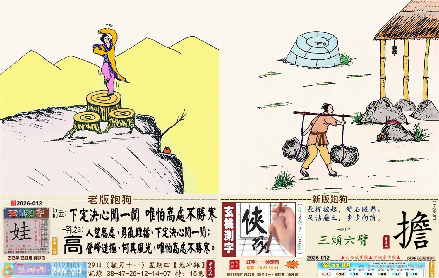 本帖最后由小歪于2026-1-2908:41编辑 2026年1月29日012期鸡(丁酉)(金箔金) 012期:老版跑狗玄機一字記之曰:【高】 詩云:下定決心闖一闖唯怕高處不勝寒 人望高處,勇氣難檔,下定決心闖一闖; 登峰造極,何其風光,唯怕高處不勝寒。 玄機測字:《娃》 密圖詩:竹藍打水一場空 《記》:八仙賀喜到門前 特碼大小單雙句:天天去市場買菜 今期必中:馬超 012期:特碼歇后語 祖奶奶的花鞋-----老式样 012期正版四字梅花诗:三天打鱼。 012期火车头:烧伤马。诗:马死兔伤,二九出特今期来。 012期香港第一手欲钱料:日本? 012期曾道人说:“三个?” 012期另版四字梅花诗:美丽神话。 012期香港第一手欲钱料:欲钱找2005年最后一期的开奖记录。 012期曾道人说:“恭贺大陆各位彩民在2005年的最后一期发大财”? 012期:二字經:多情 012期:二流子是特码 012期:智力金壤;左道旁门 012期:信箱紅字:【一錘定音】 012期:【暗碼:13-28-34-41】 012期:一語中特:【三頭六臂】 發財玄機圖:聞嗅探索警覺性強圖中明鼠紅藍 012期:藏寳圖 新:家在画桥堤下住 老:古来惟有酒偏香 禁:猴禁:9尾玄機字《读》 2026年012期【生活幽默】版 〖一個專養乳牛的牧場〗 一個專養乳牛的牧場,爲了維持牧場内牛衹的数量,在母牛群中放養了一衹公的乳牛。但是時間久了,這衹公牛也老了,開始有點力不從心,于是牧場的主人又買了一衹新的公牛來擔任維持牛衹數量的工作。至于那衹老公牛,由于過去数年來,它没有功勞也有苦勞,所以主人還是繼續放它在母牛群裹逍遥。有一天,主人去巡視牧場,看見老公牛氣喘嘘地趴在草地上。牧場主人走近説:你年紀大了就收斂一點,不要作這多。老公牛一臉無辜的説:你難道不能告訴那衹新來的,我不是母牛!