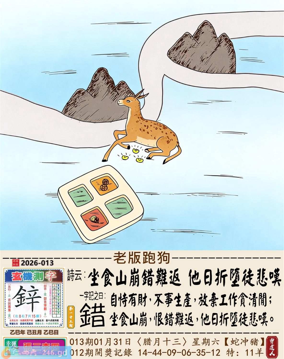 2026年1月31日013期(猪(己亥)(覆灯火) 013期:老版跑狗玄機一字記之曰:【錯】 詩云:坐食山崩錯難返他日折墮徒悲嘆 自恃有財,不事生產,放棄工作貪清閒; 坐食山崩,恨錯難返,他日折墮徒悲嘆。 玄機測字:《鋅》 密圖詩:英雄難過美人關 《記》:一個早上跑五圈 特碼大小單雙句:四鄉八里先后 今期必中:大喬 013期:特碼歇后語 钻子遇到锉子-----死对头 013期正版四字梅花诗:酒绿灯红。 013期火车头:烧伤狗。诗:马死牛伤,一蛇延愿十里长。 013期香港第一手欲钱料:马? 013期曾道人说:“三楼” 013期另版四字梅花诗:三百六十。 013期香港第一手欲钱料:欲钱看狗是怎么跑的。 013期曾道人说:“为什么地球是在转的”? 013期:二字經:今期 013期:鸡蛋是特码 013期:智力金壤;甜言蜜语 013期:信箱紅字:【坐吃山空】 013期:【暗碼:05-21-42-47】 013期:一語中特:【二人三足】 發財玄機圖:防患未然斜目睨視圖中明龍蛇藍綠 013期:藏寳圖 新:遥知贼胆纵横破 老:锦树摧残胡蝶老 禁:鼠禁:0尾玄机字《虚》 2026年013期【生活幽默】版 〖小偷〗 一小偷偷了個錢包,不久後落網。 在派出所他看到受害者, 小偷:"大哥,你錢包裏明明衹有2000塊,你怎磨説被偷了5000塊?後果很嚴重的!" 受害者:"兄弟,幫哥個忙,上個月我多花了3000,没法给媳姆報賬,正好你把我錢包偷了,這不......" 小偷噗通跪地:"大哥,我媳婦比你媳婦狠多 了,如果她以爲我偷了5000塊,衹上交2000,她會把我弄死不可,大哥,都是男人,你發發慈悲吧!"