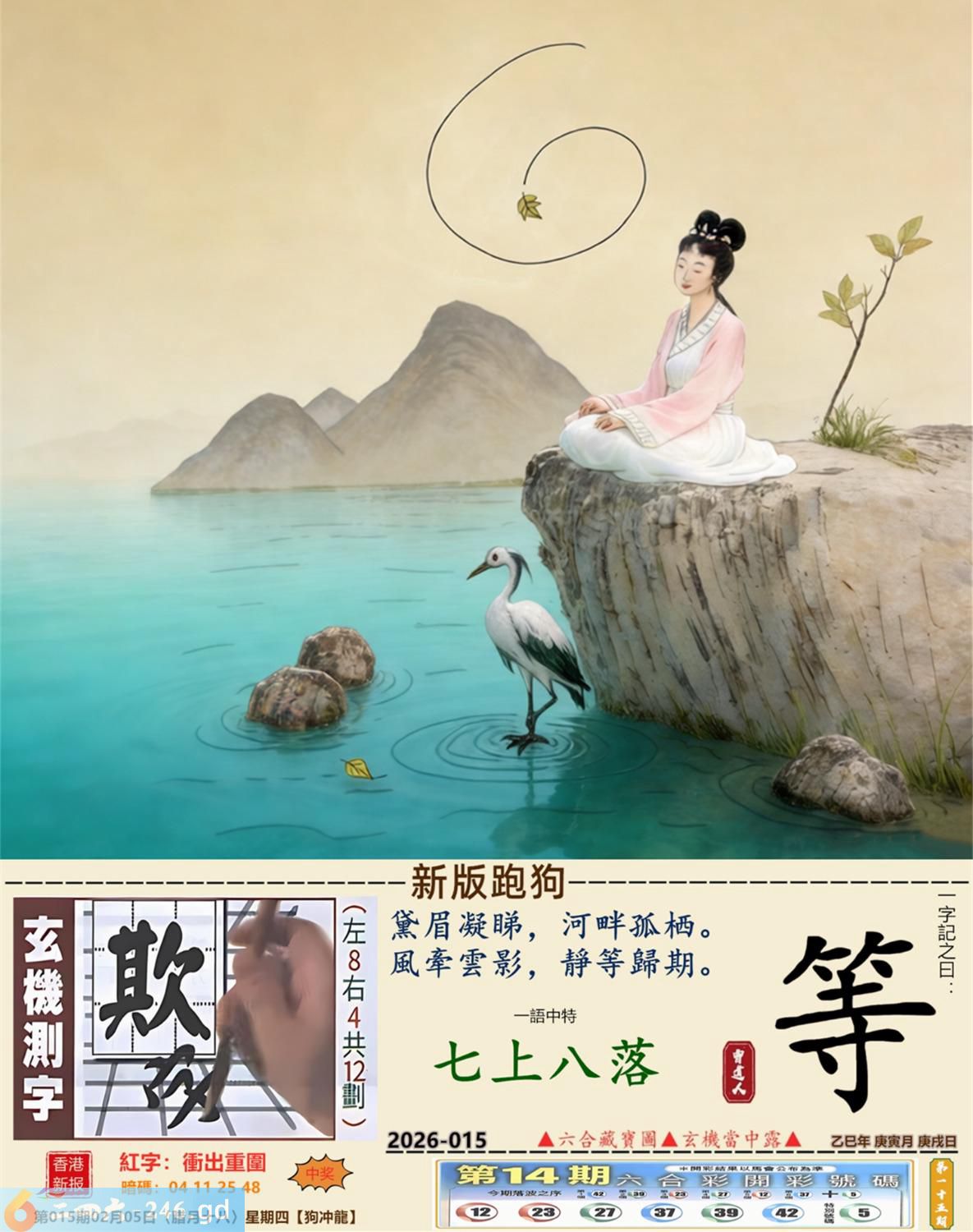 2026年2月5日015期龙(甲辰)(钗钏金) 015期:老版跑狗玄機一字記之曰:【馬】 詩云:馬到成功福延綿下定決心不怕遲 突破重圍,闖出新天,馬到成功福延綿; 時逢立春,新年已至,下定決心不怕遲。 玄機測字:《炸》 密圖詩:一臉家逼買三四 《記》:八面來風臘月會 特碼大小單雙句:小小買注二十塊 今期必中:馬岱 015期:特碼歇后語 嘴上无毛-----办事不牢 015期正版四字梅花诗:避而远之。 015期火车头:烧伤马。诗:鸡死狗伤,困龙暂且藏淤泥。 015期香港第一手欲钱料:二一。 015期曾道人说:“原油?” 015期另版四字梅花诗:四三发财。 015期香港第一手欲钱料:欲钱去看温柔可爱的动物。 015期曾道人说:“请问太阳为什么可以发电”? 015期:二字經:收藏 015期:面包是特码 015期:智力金壤;千钧一发 015期:信箱紅字:【衝出重圍】 015期:【暗碼:04-11-25-48】 015期:一語中特:【七上八落】 發財玄機圖:敏感非常弓身防禦圖中明蛇紅綠 015期:藏寶圖 新:蓬阁桃源两处分 老:江山王气空千劫 禁:马禁:7尾玄機字《象》 2026年015期【生活幽默】版 〖知音在此〗 某書生酷爱彈琴,常常感慨知音難尋,鬱鬱不樂。 一日在房中彈琴清遣,忽聞隔壁有嘆息之聲。書生大喜:"原來知音在此呀!" 歡歡喜喜地去鄰家叩門。開門的却是個老婦。老婦哭着説:"觸景生情啊,我兒子生前以彈棉花爲生,先生您彈的太像他了。"