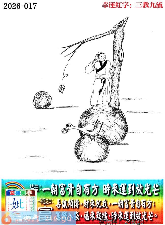 017期老版跑狗一字記之曰:【富】 詩雲:一朝富貴自有方,時來運到放光芒。 喜訊頻傳,財來就我,一朝富貴自有方; 塞錢入袋,福來難擋,時來運到放光芒。 玄機測字:《妣》