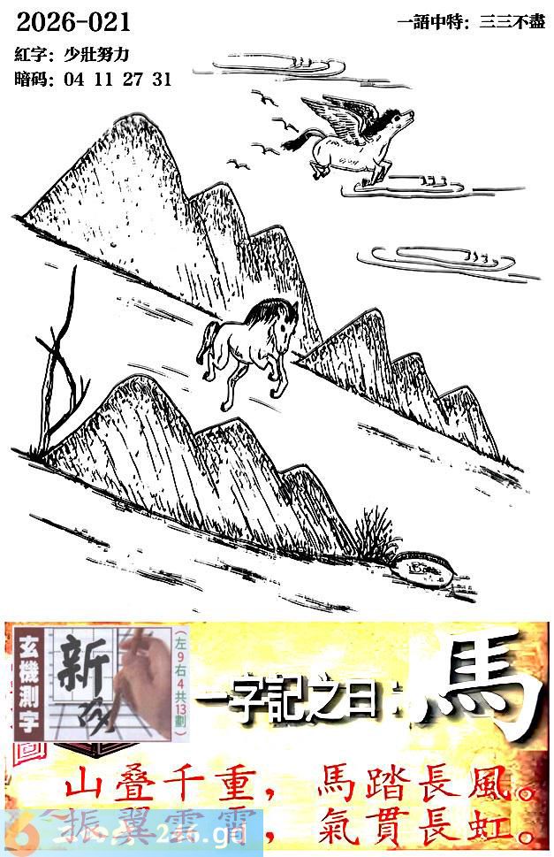 021期跑狗一字記之曰:【馬】 山疊千重,馬踏長風。 振翼雲霄,氣貫長虹。 玄機測字:《新》 一語中特:三三不盡