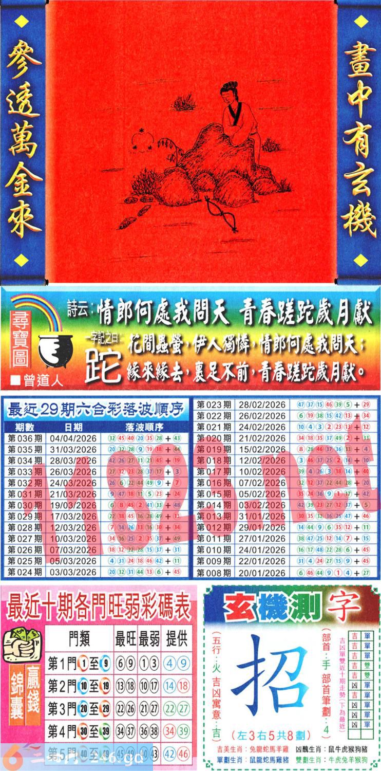 本帖最后由天下第二于2026-4-516:10编辑 037期老版跑狗一字記之曰:【跎】 詩雲:情郎何處我問天,青春蹉跎歲月獻。 花間蟲螢,伊人獨憐,情郎何處我問天; 緣來緣去,裹足不前,青春蹉跎歲月獻。